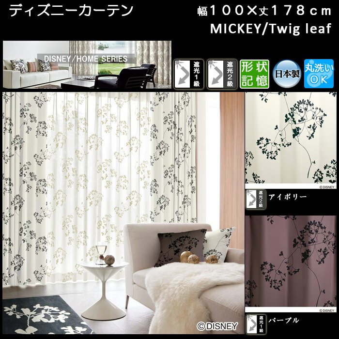 ディズニーカーテン ミッキー/トウィッグリーフ(MICKEY/Twig leaf)遮光カーテン(遮光1・2級)形状記憶・ウォッシャブル日本製カーテン ■幅100×丈178cm ※上イメージ画像一番右側のカーテン(M-1003パープル)です。